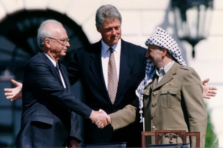 经过与以色列国政府的秘密谈判,1993年8月20日,巴勒斯坦解放组织主席阿拉法特和以色列总理拉宾在挪威奥斯陆经过会晤后达成了一些共识。9月13日,双方在美国白宫草坪签署了被称为”奥斯陆协议”的《临时自治安排原则宣言》。但2年后拉宾遇刺身亡以及巴勒斯坦极端分子对以色列国发动的恐怖袭击使得奥斯陆协议的执行被无限期推迟。