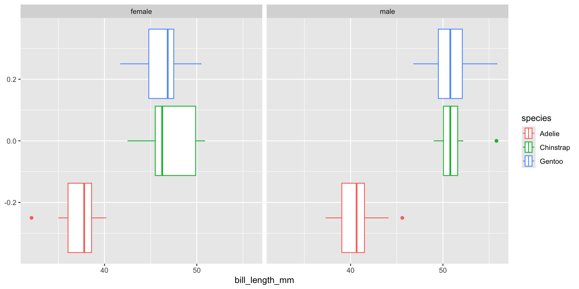 Fit: aov(formula = bill_length_mm ~ species * sex, data = drop_na(penguins, sex))